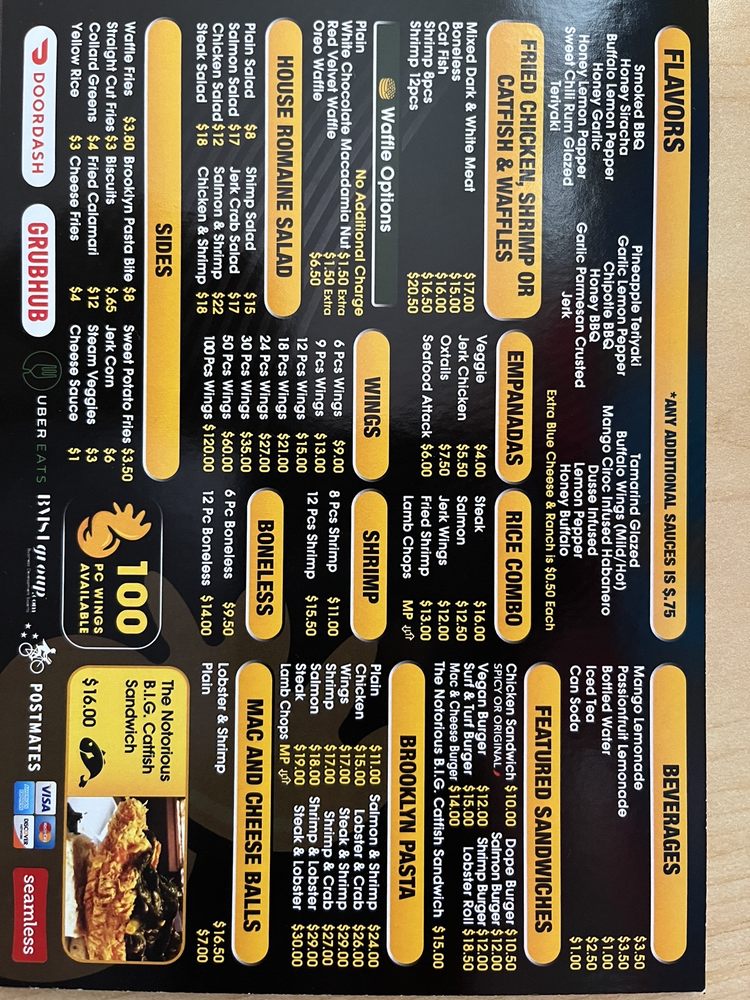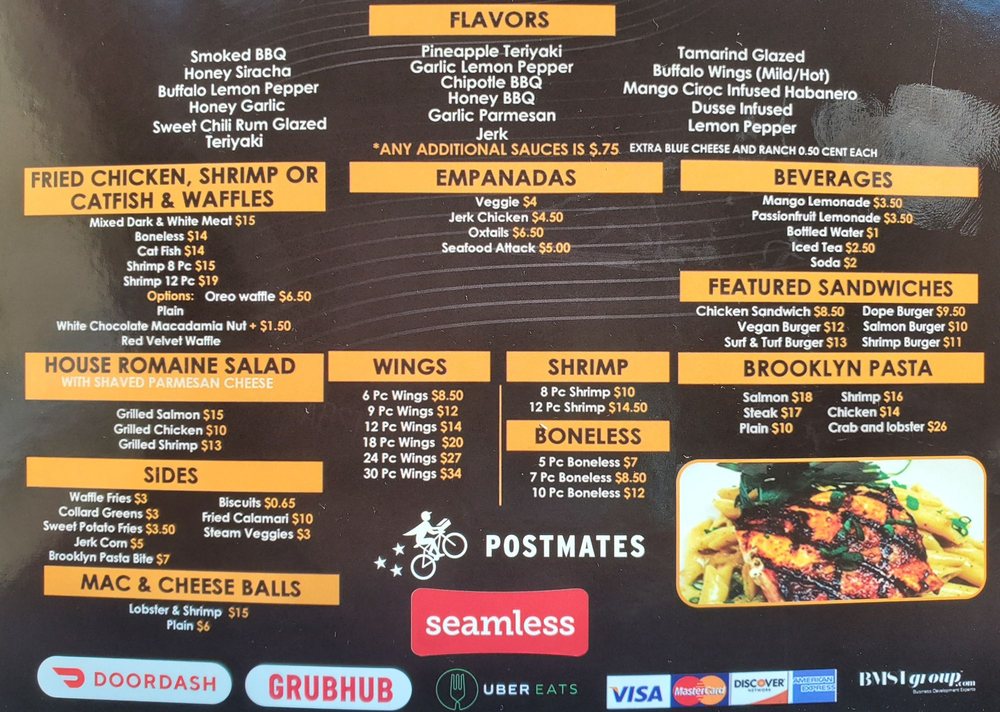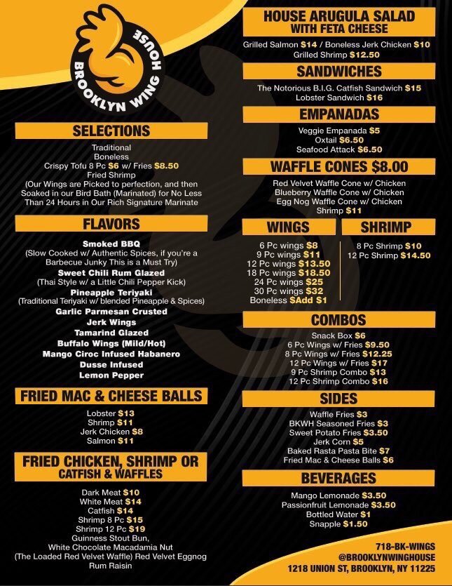Located in Brooklyn, NY, Brooklyn Wing House is a must-visit spot for chicken wing enthusiasts. With a wide array of flavorful wing options like tamarind glazed, mango habanero, lemon pepper, and jerk, there's something to satisfy every palate. Customers rave about the unique dishes such as sweet chili wings, fried shrimp with yellow rice, and oxtail empanadas, praising the delicious flavors and generous portions. The restaurant offers convenient delivery and takeout options, making it easy to enjoy their mouthwatering creations at home. Whether you're a fan of classic wings and fries or looking to try something different like the salmon burger or chicken sandwich, Brooklyn Wing House is sure to impress with its flavorful menu and excellent service. Make sure to add this gem to your list of go-to restaurants for a satisfying meal.